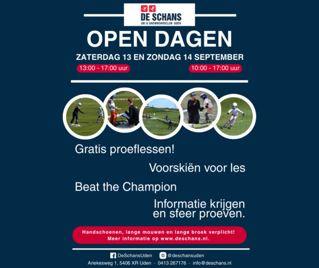 Op zaterdag 13 september van 13.00 tot 17.00 uur en zondag 14 september van 10.00 tot 17.00 uur vinden de Open Dagen plaats. Tijdens deze momenten is er vrije inloop om te komen voorskiën om jouw niveau voor de lessen te bepalen. Voor de snowboarders geldt dat er alleen op zaterdag snowboardleraren zijn voor bepaling…