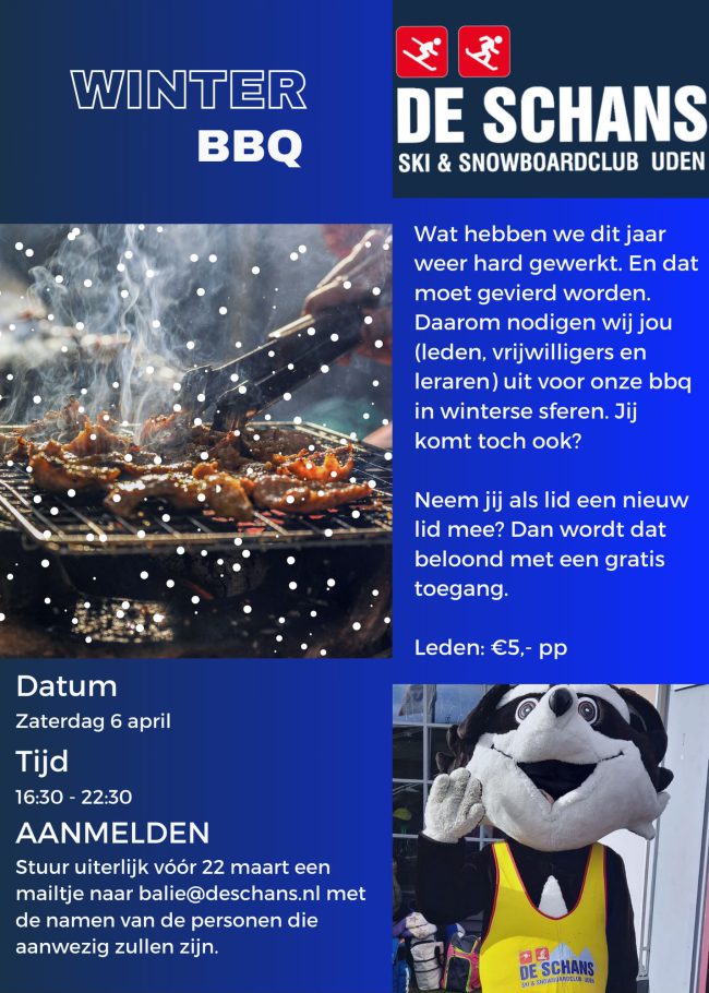 Wij nodigen onze leden, vrijwilligers en leraren uit voor onze bbq in winterse sferen. Entree is € 5,00 voor leden. Maar neem je als lid een nieuw lid mee? Dan wordt dat beloond met een gratis toegang. Meld je uiterlijk vóór 22 maart aan met een e-mail naar balie@deschans.nl met daarin de personen die aanwezig…